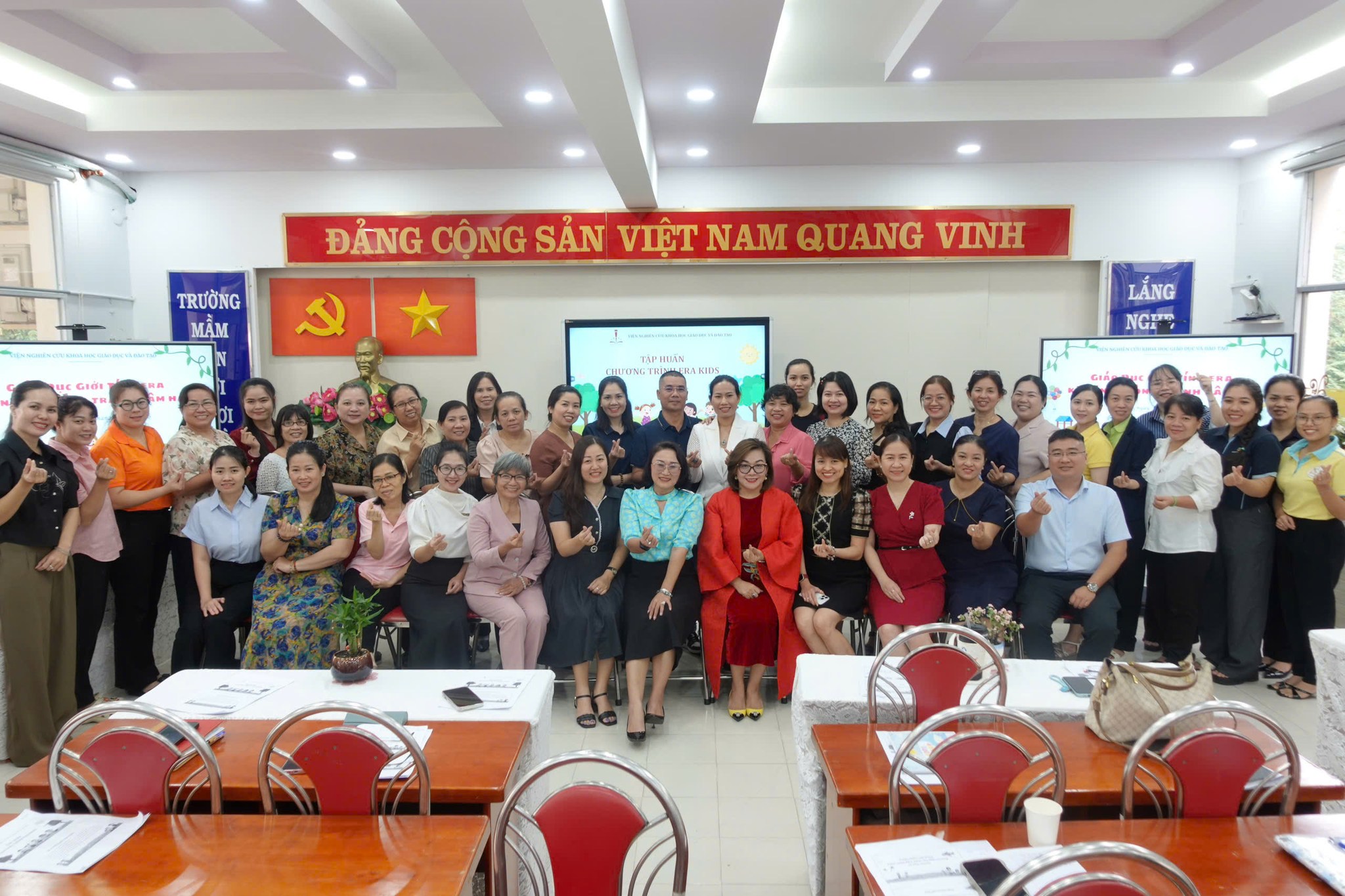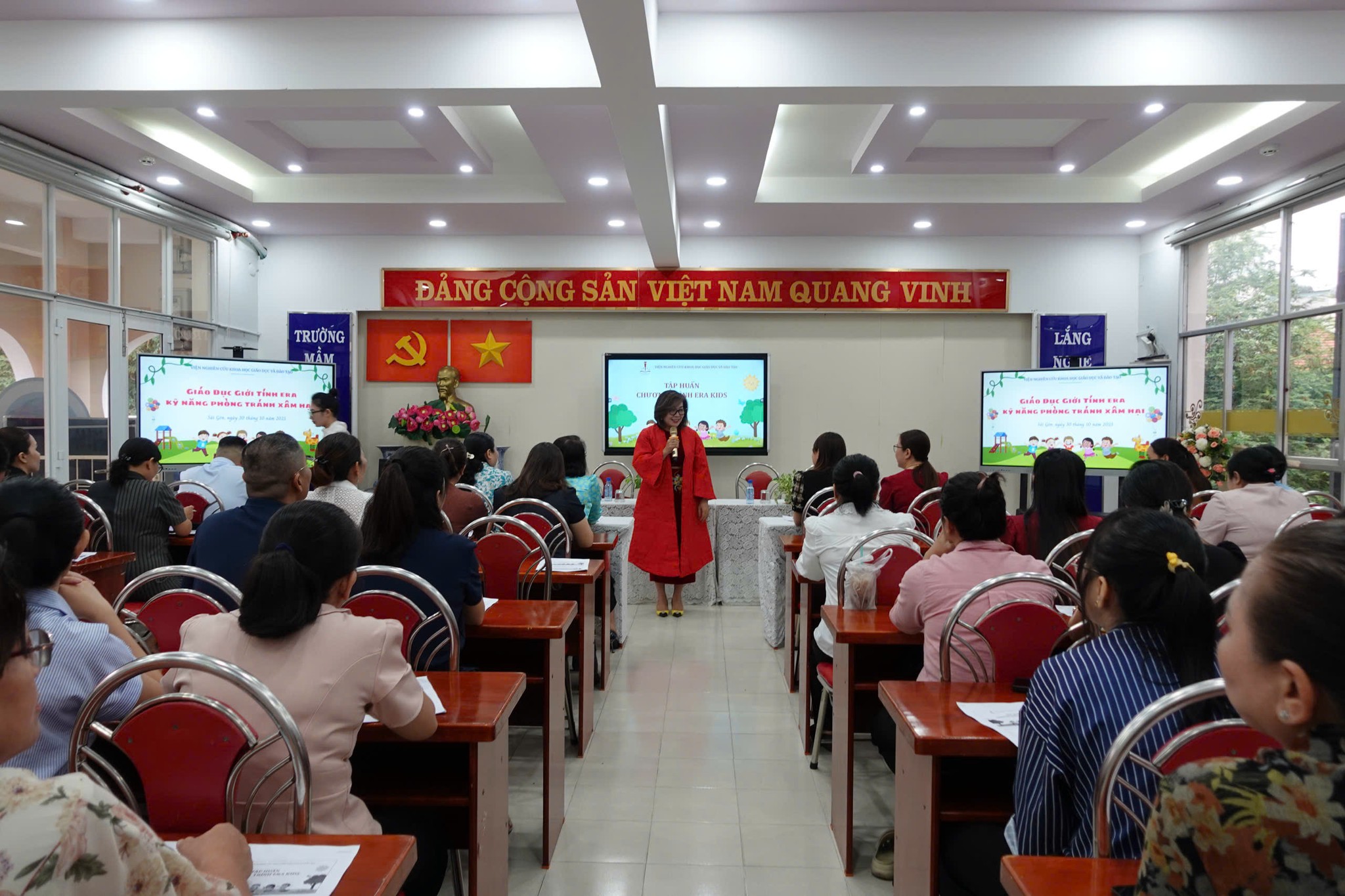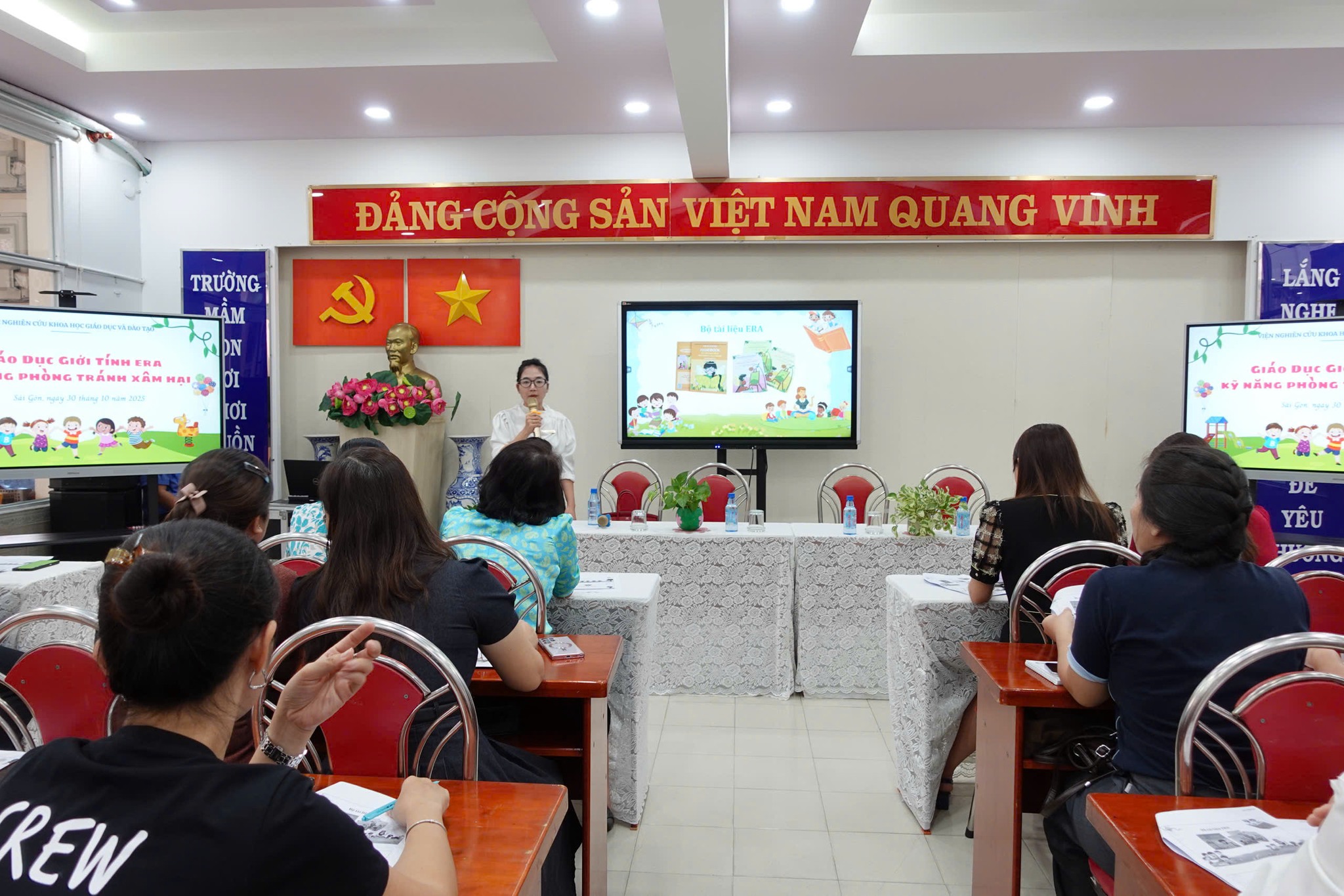 Tại Trường Mầm non 30/4, Viện Nghiên cứu Khoa học Giáo dục và Đào tạo đã tổ chức buổi tập huấn chương trình “Giáo dục giới tính ERA – Kỹ năng phòng tránh xâm hại cho trẻ 3–5 tuổi” dành cho chuyên viên Phòng Văn hóa – Xã hội; Hiệu trưởng, Phó Hiệu trưởng, chủ nhóm lớp và giáo viên mầm non tại các phường Bến Thành, Cầu Ông Lãnh, Sài Gòn và Tân Định.
